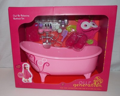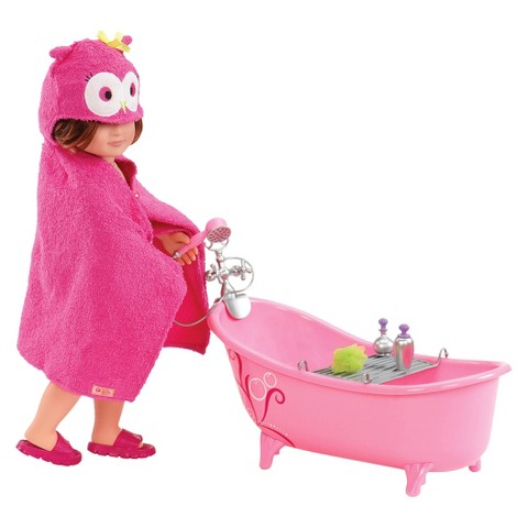 Our Generation ® Dolls Includes: pink bathtub, faucet, bath tray, bath puff, bath mat, 2 cucumber slices, 3 bottles of nail polish, 3 bottles, 3 canisters, perfume bottle, clothes hanger, comb, hooded owl towel and pair of shower sandals. ... Fetch Doc